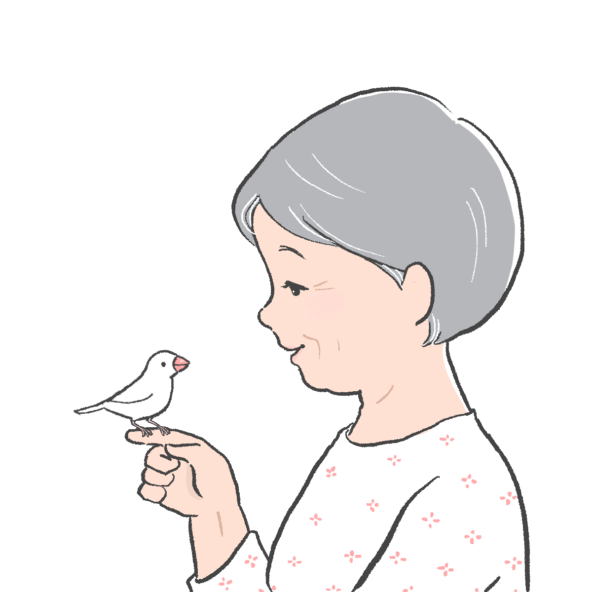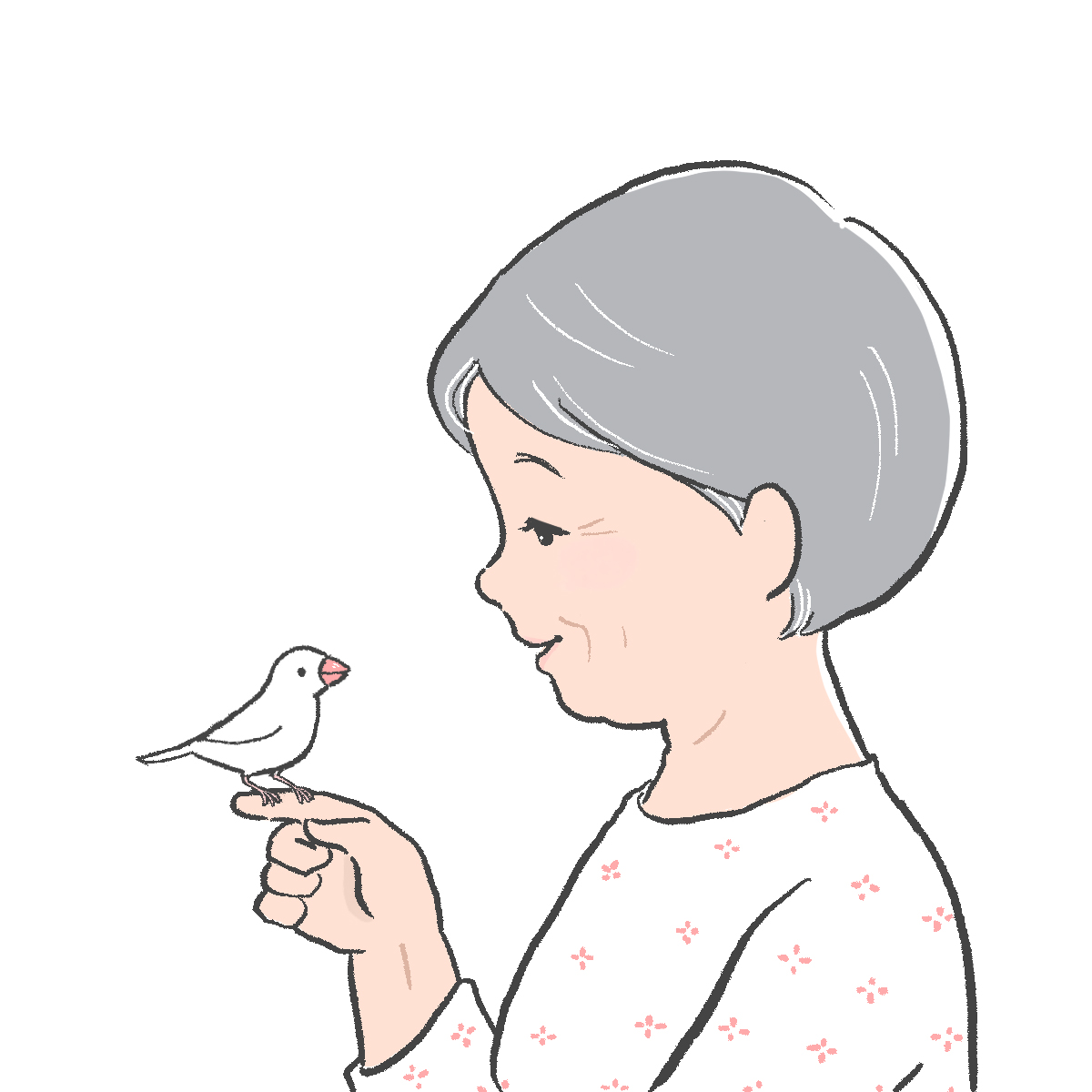 おばあさんが優しい表情で小鳥を見ている場面です。