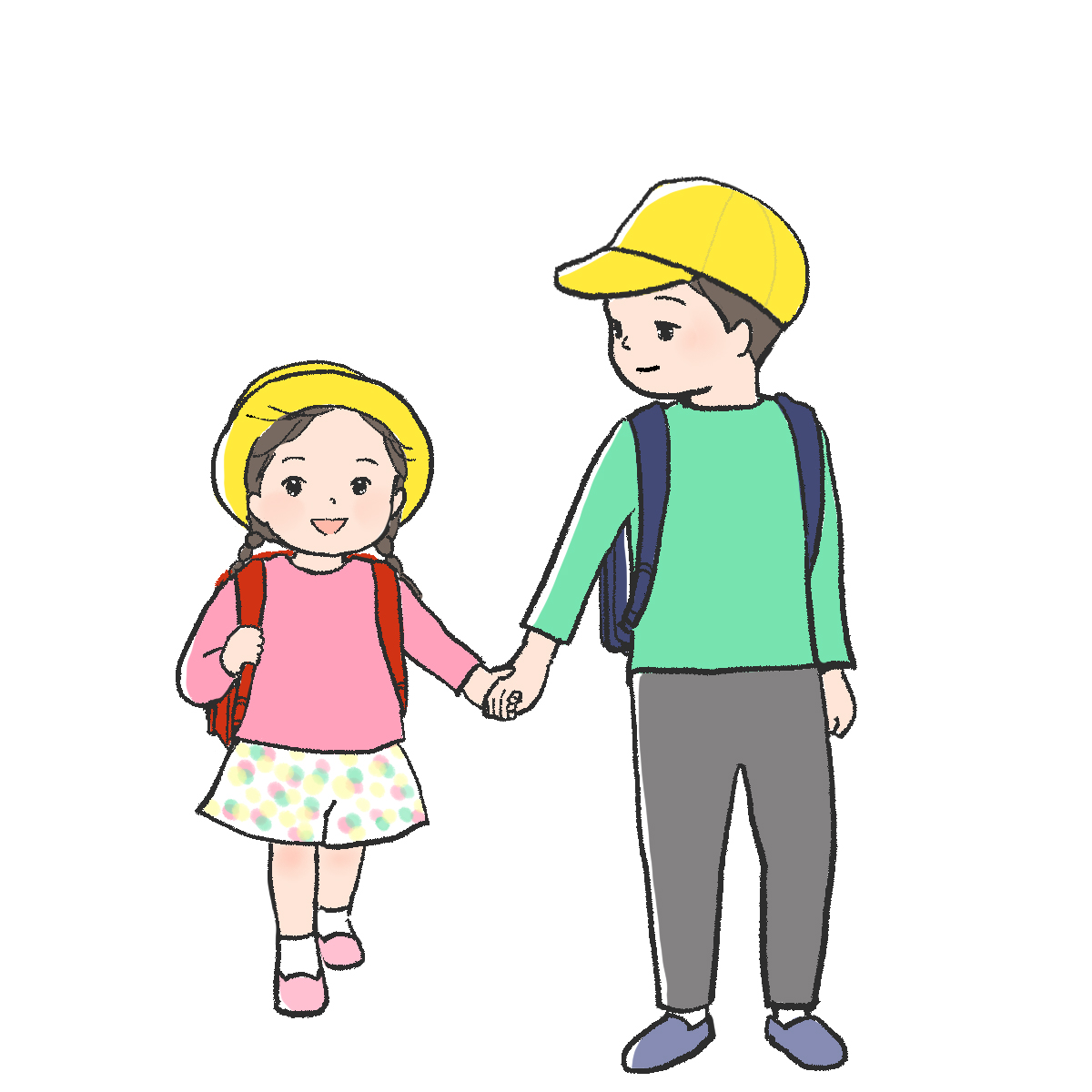 お兄ちゃんと妹が手をつないで登校する場面です。