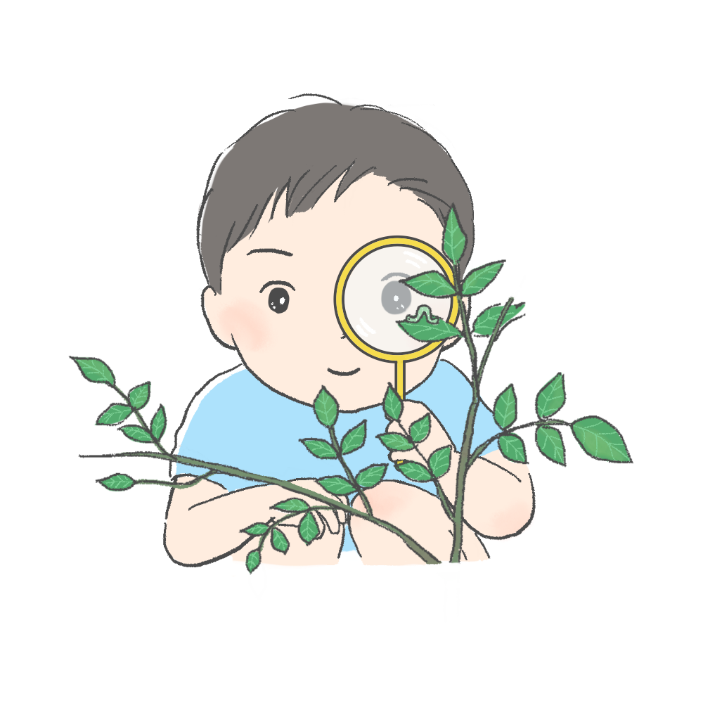 生活葉っぱを這うシャクトリムシを虫眼鏡で観察する子どもを描きました。