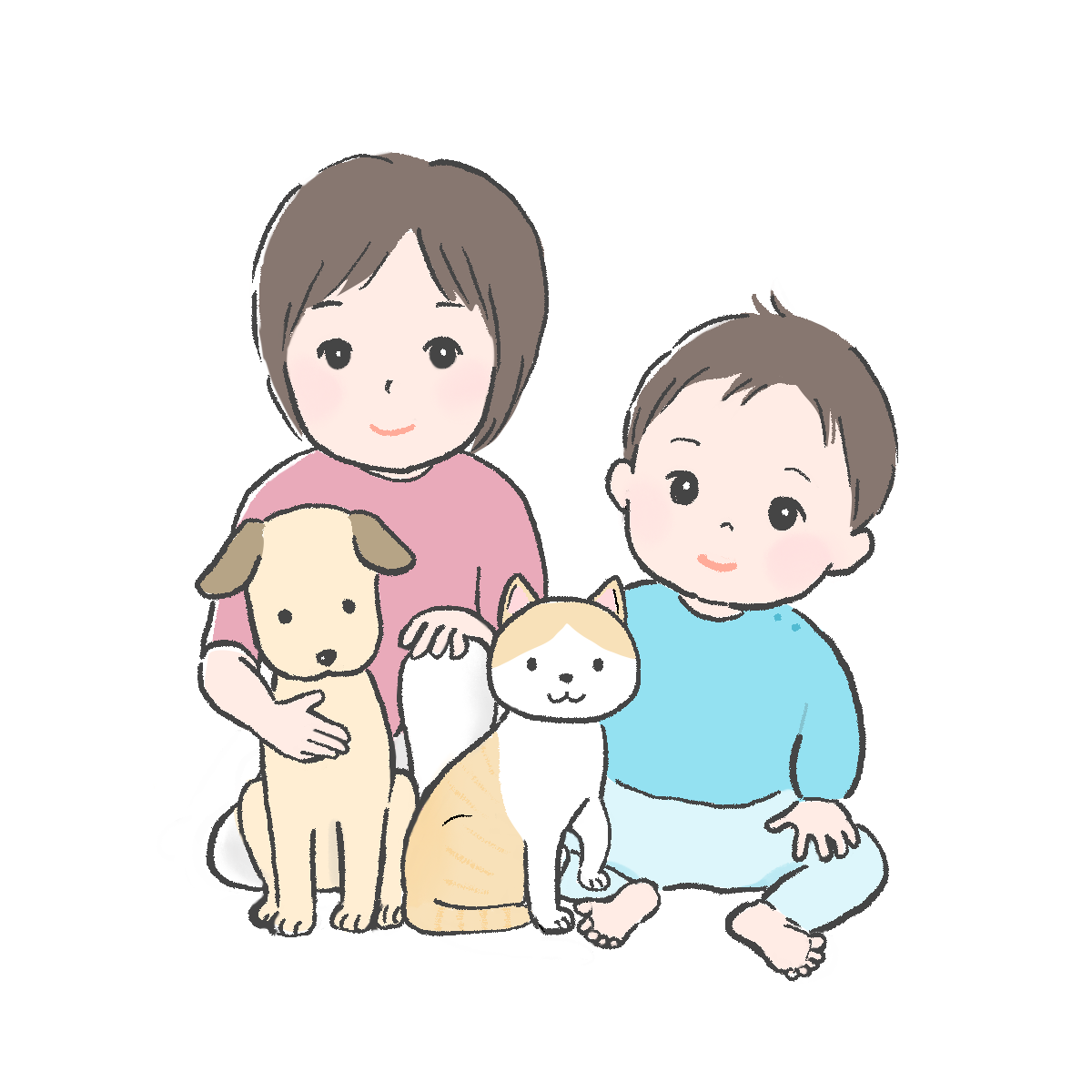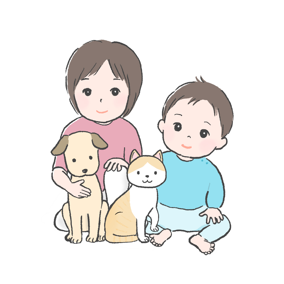 生活犬と猫と子どもたちのイラストです。みんな大事な家族ですね。