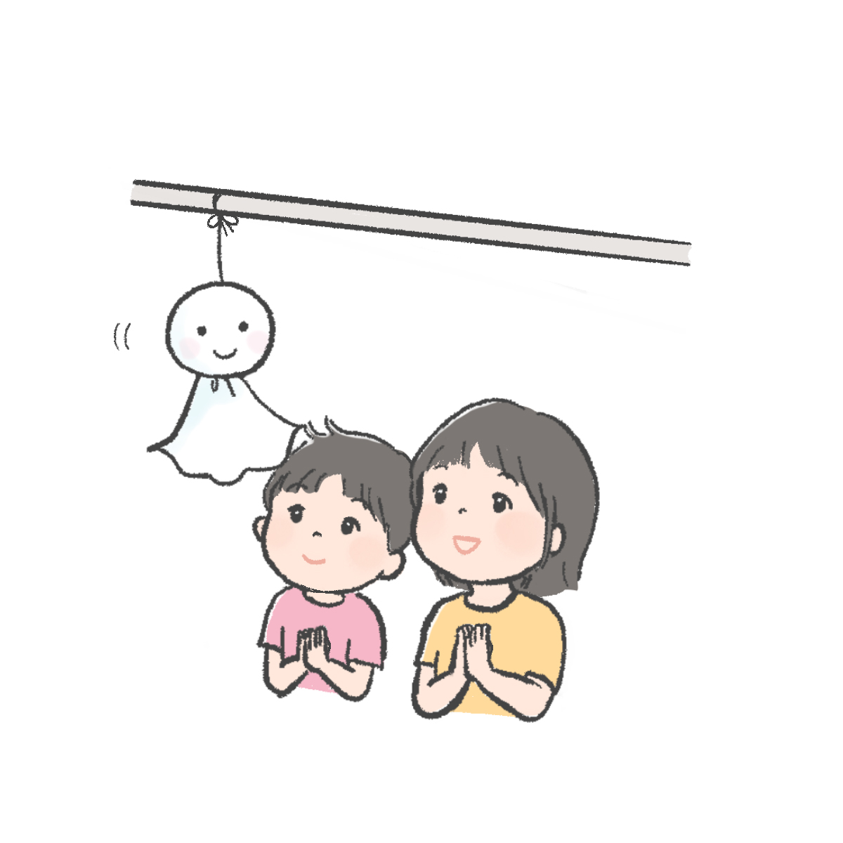 「明日は晴れますように」と、てるてる坊主にお願いする姉弟のイラストです。