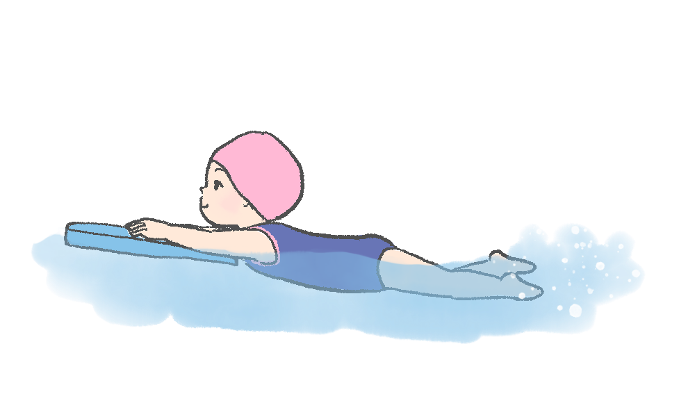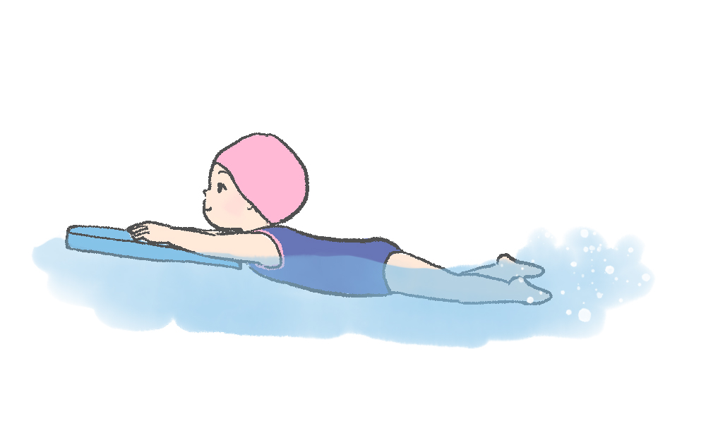 ビート板を使ってバタ足の練習をする子どものイラストです。