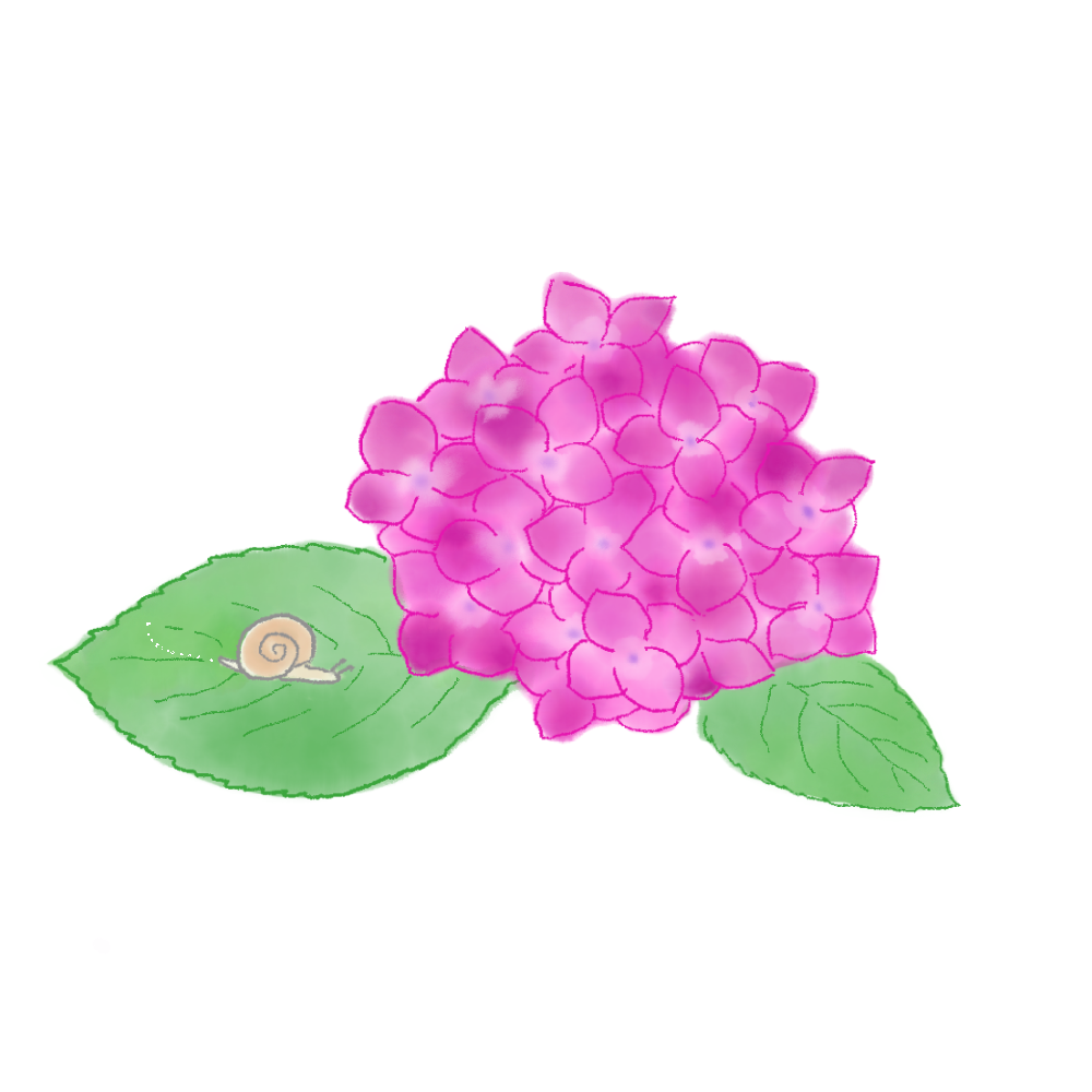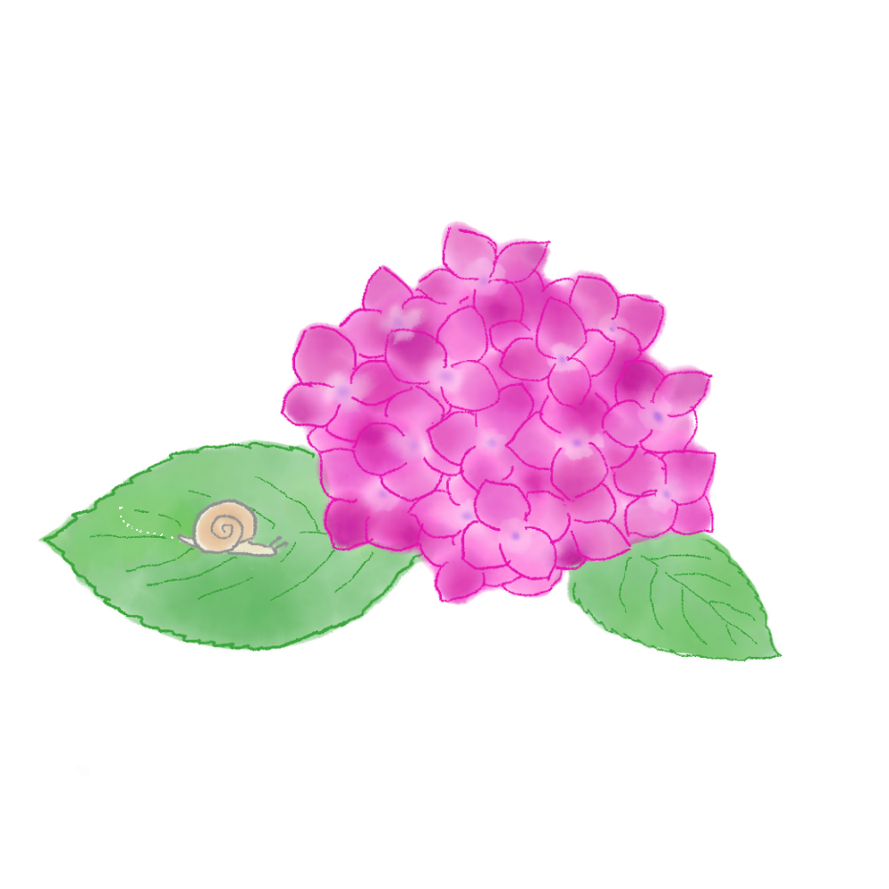 アジサイと葉っぱの上をゆっくりと這うカタツムリのイラストです。