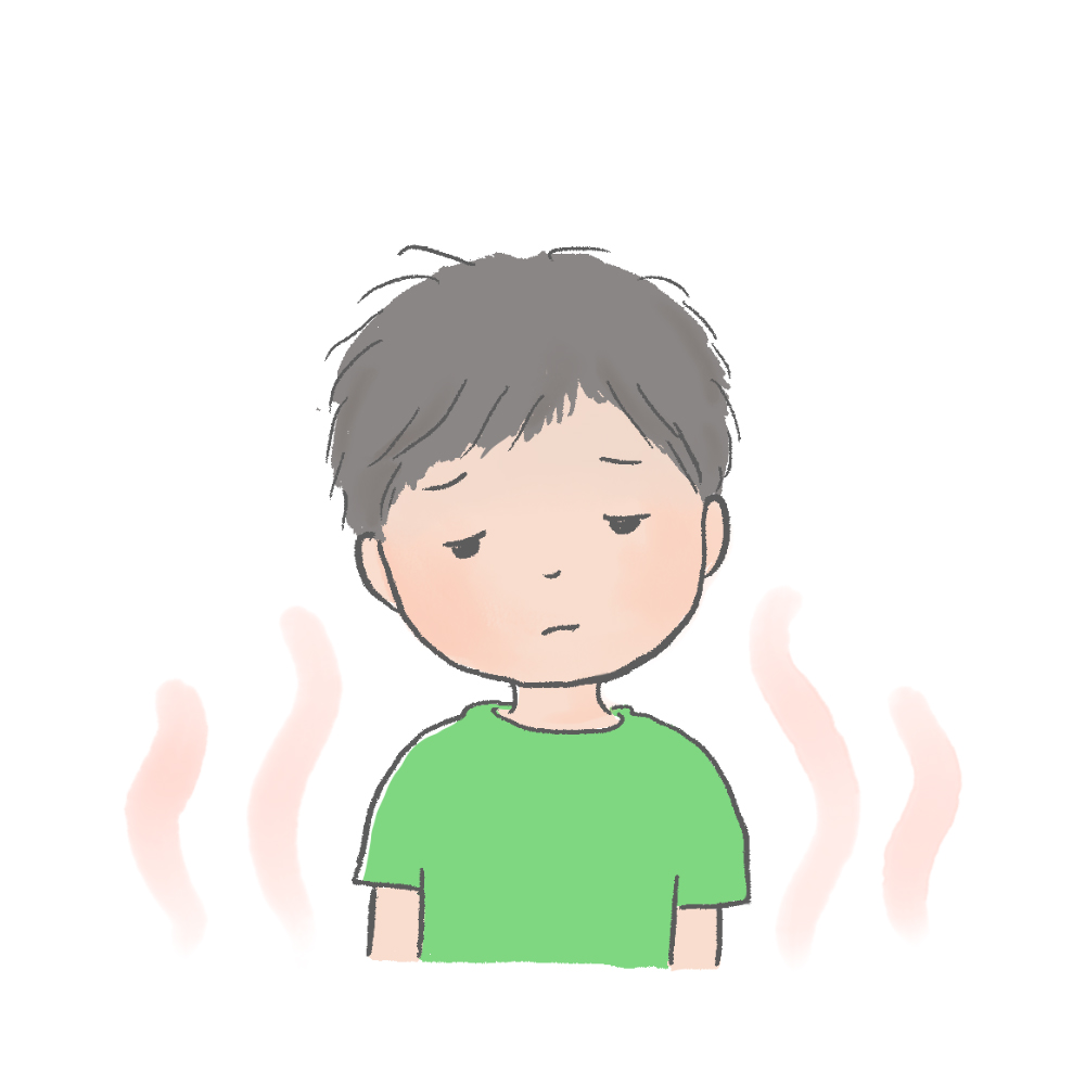熱中症の症状が出て、気分が悪そうな子どものイラストです。