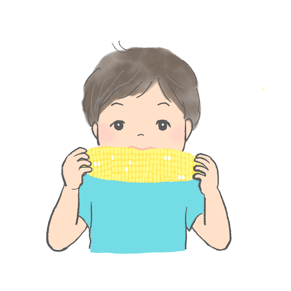 とうもろこしにかぶりつく子どものイラストです。