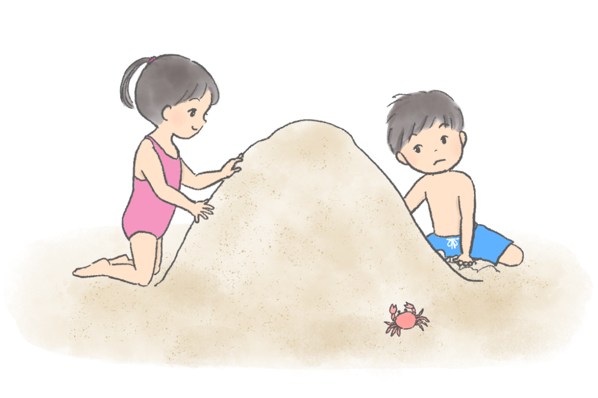 砂浜で砂の山を作って遊ぶ子どもたちのイラストです。