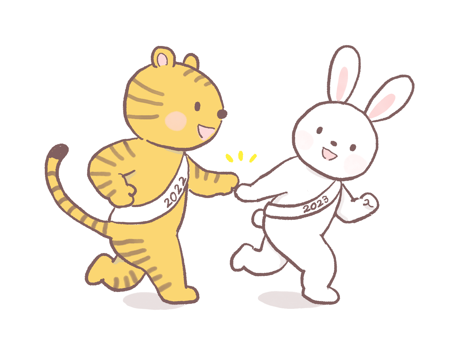 トラからうさぎへバトンタッチ いきもの 2023.01.012023.11.29 jpgを保存 pngを保存 トラ(2022年)からうさぎ(2023年)にバトン(タスキですが)タッチするイラストです。 さしえや 年賀状の素材にもご利用いただけそうですね。