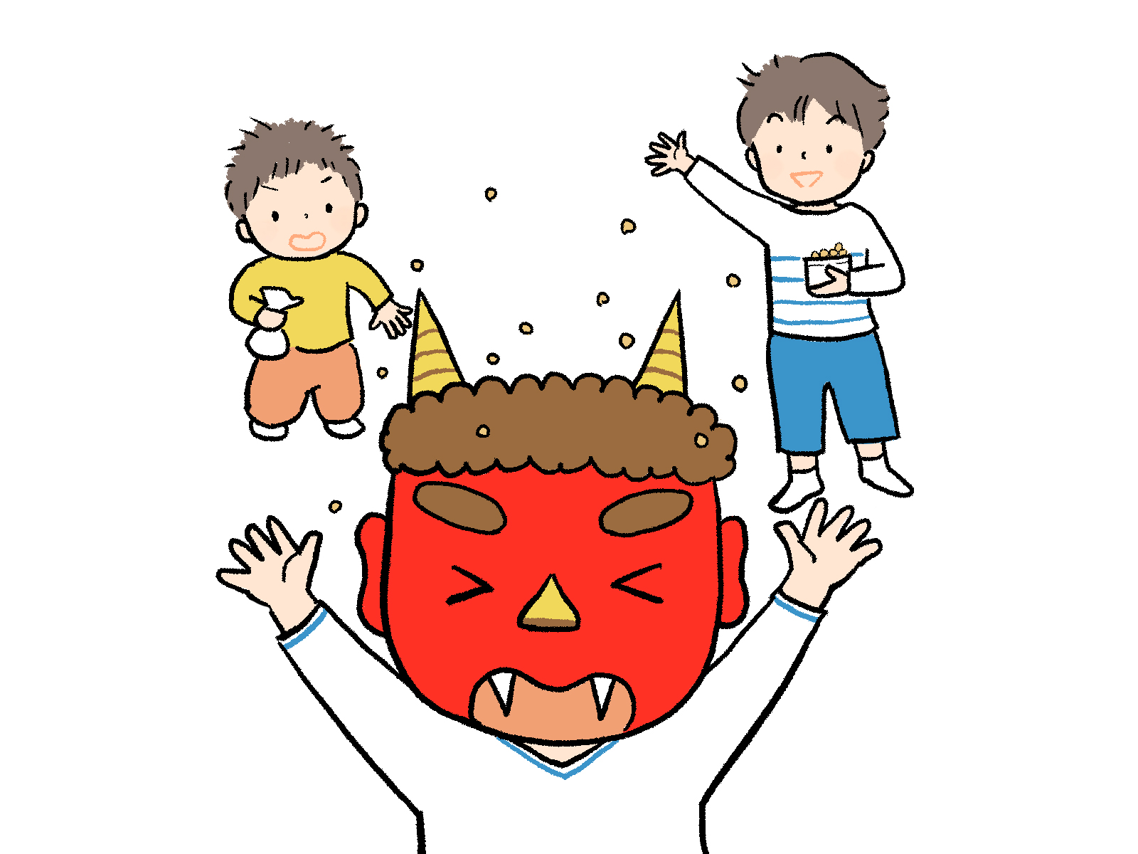 鬼は外!福は内!豆まきをする子どもたちと逃げ出す鬼のイラストです。