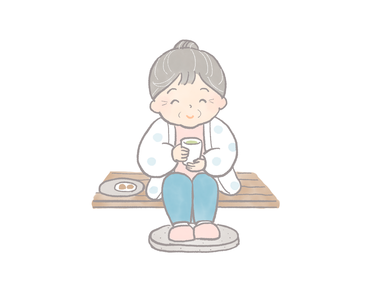 縁側でゆっくりお茶を飲むおばあさんのイラストです。