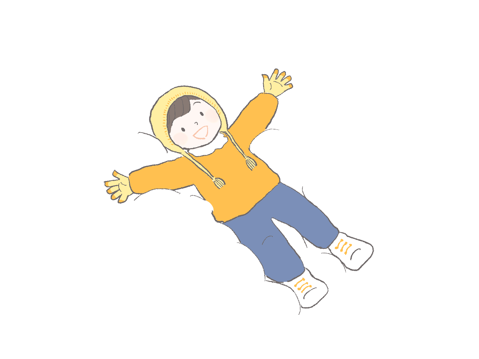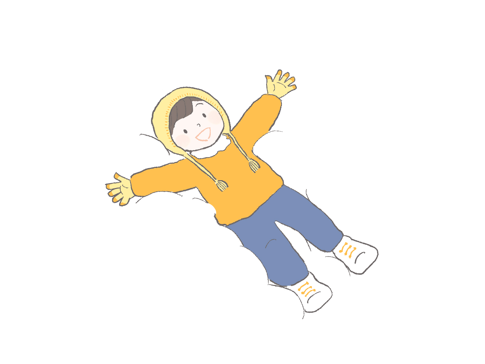 冬雪の上に寝転がって空を眺める子どものイラストです。