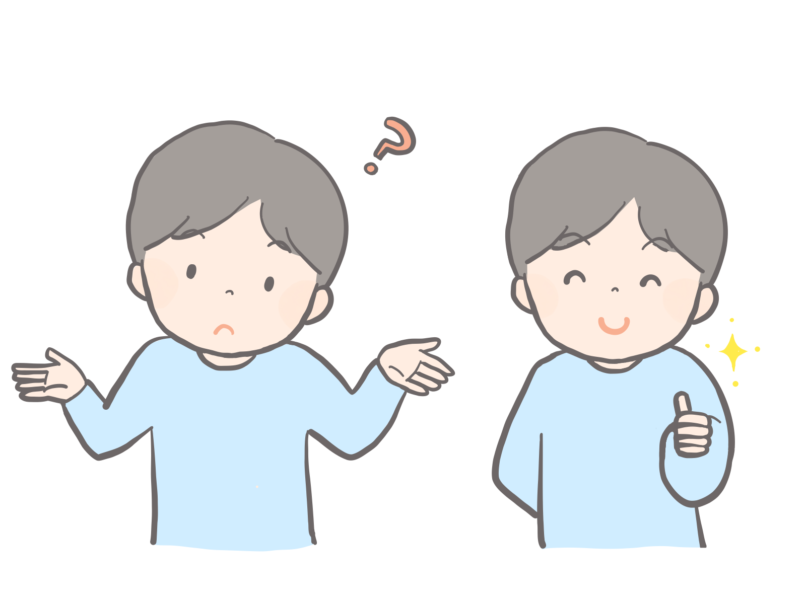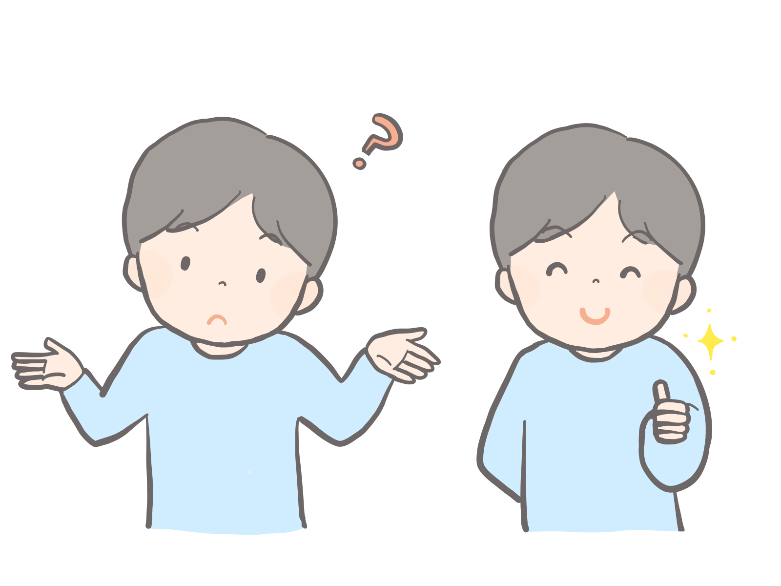 なぜ?と小首をかしげる人、やったね!と親指を立てる人のイラストです。