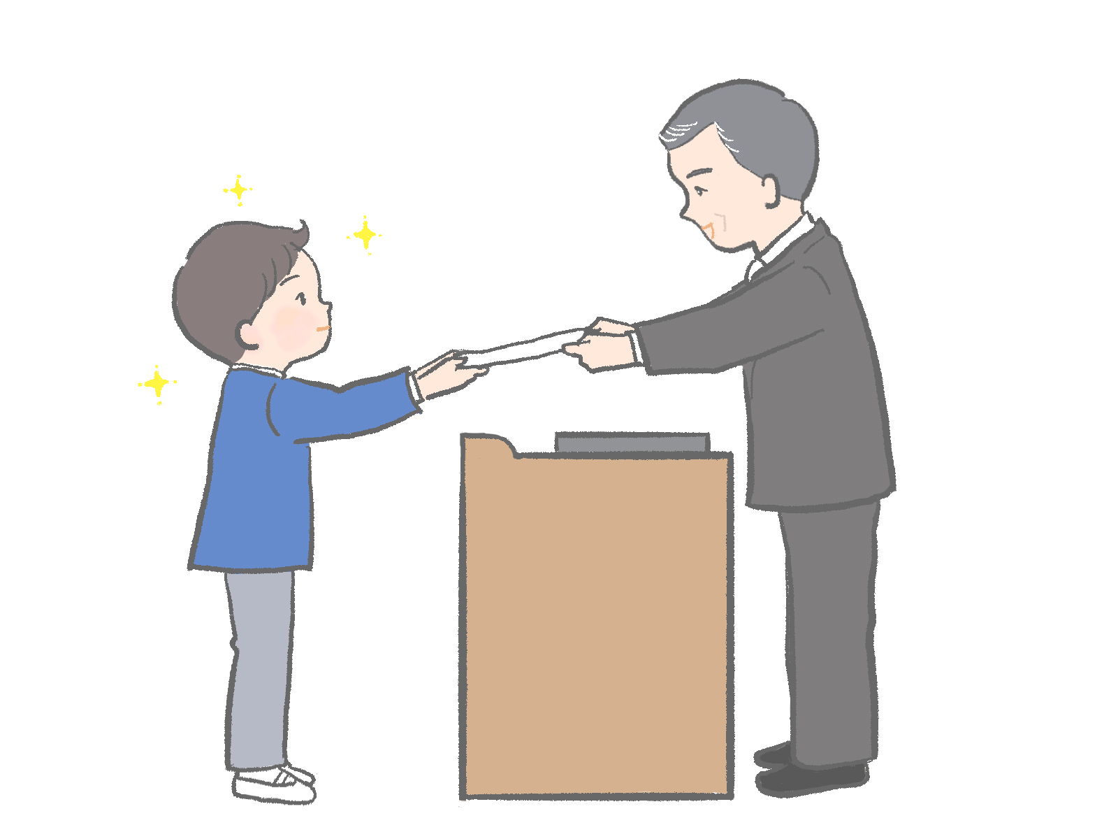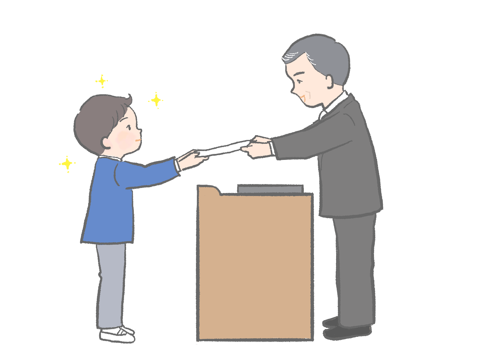 小学校の卒業式。校長先生から卒業証書を受け取る小学生のイラストです。